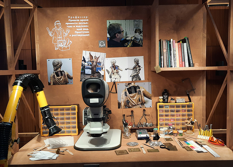 инсталляциями, экранами с анимационными фильмами и исследовательским видеоконтентом, текстовыми блоками и тактильными моделями, которые работают как визуальные подсказки, «улики», позволяя шаг за шагом реконструировать судьбу памятника.
