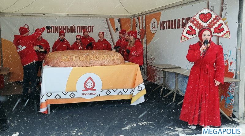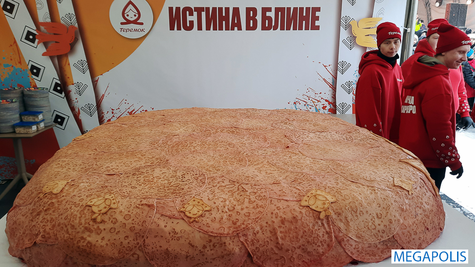 700 килограммовый блинный торт готовили 8 человек в течении 12 часов. Было приготовлено 4500 порций.