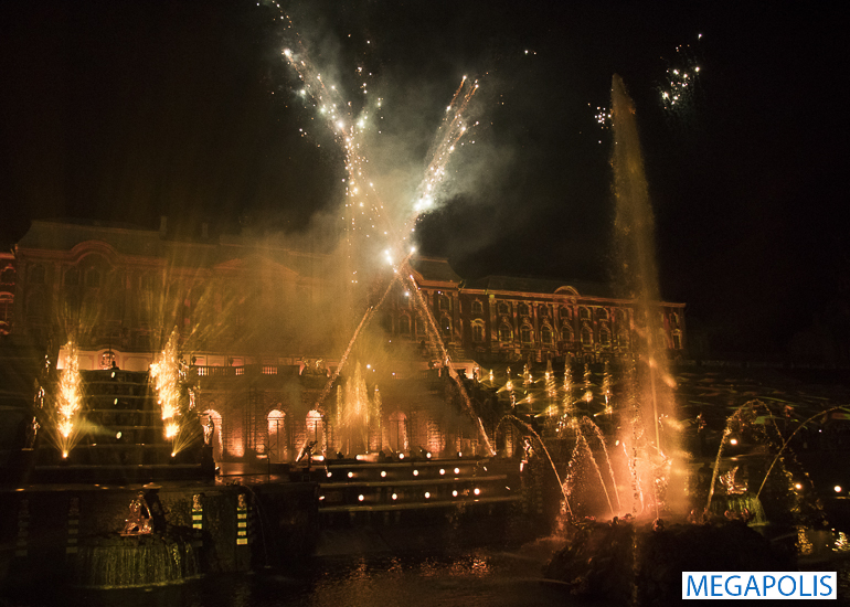 Сам Большой каскад стал частью огненного шоу. А в финале зрителей ждал грандиозный фейерверк.